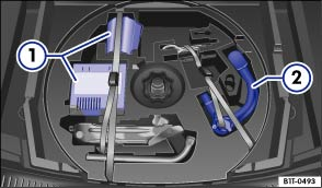 Fig. 199 Under the floor covering in the luggage compartment: vehicle tools, breakdown set ① and removable ball coupling ②
